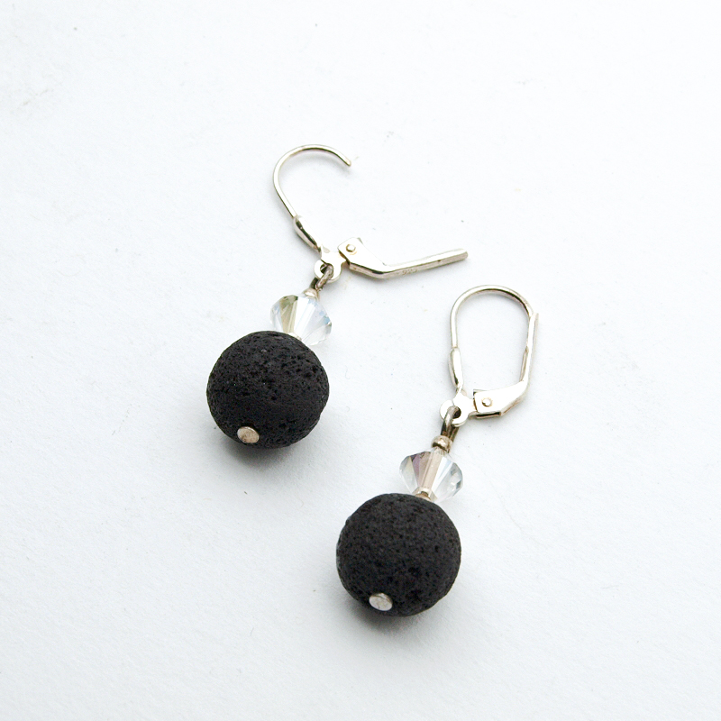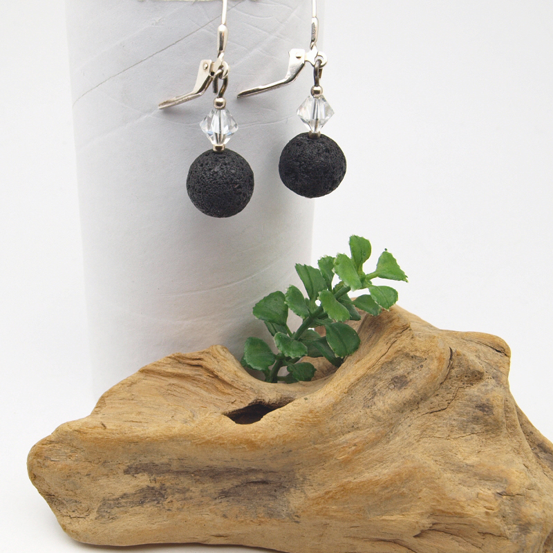 und schwarzen Lava Kugeln. Die matten Lavaperlen sind, ca. 8 mm stark und mit je einer geschliffenen Swarovski Perle ergänzt. Gehalten durch Klapp-Brisuren aus 925 Sterlingsilber lassen sich die Lava Ohrringe sicher tragen.