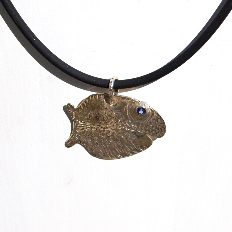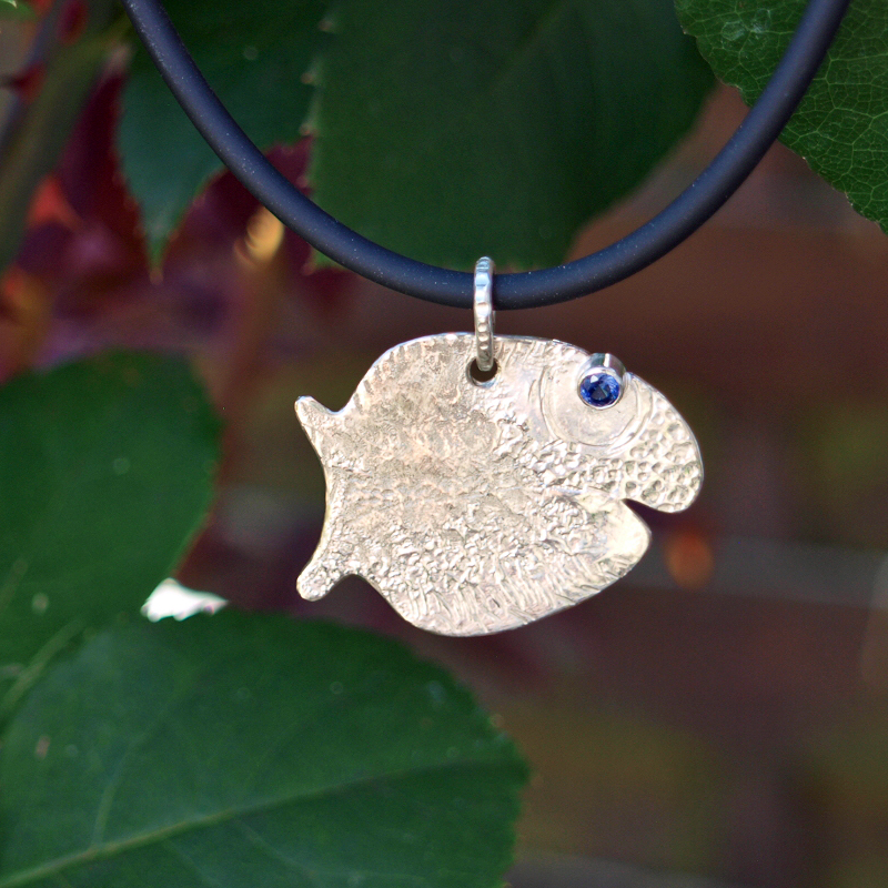 Als Auge wurde der Flunder ein geschliffener Tansanit eingesetzt. Die Fassung für den Tansanit wurde absichtlich schräg angelötet, so daß der Blick der Flunder nach unten geht. Durch das Flambieren der Oberfläche entsteht immer eine leicht wellige Struktur, die jedesmal anders ausfällt. Der Ketten Anhänger ist mit einem gehämmerten Silberring als Aufhängung versehen und kann Ketten bis zu einem Durchmesser von 4 mm aufnehmen.