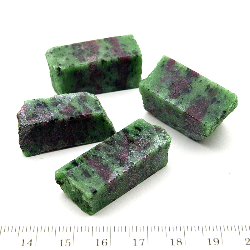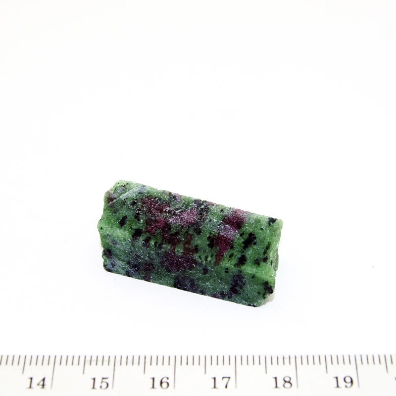Eine einzigartige Kombination der Natur: Roter Rubin im Trägerstein Zoisit, der durch seine schwarzen Punkte im dunkelgrünen Stein, einer Kiwifrucht gleicht. Der Rohstein kommt aus Tansania und eignet sich hervorragend zum Schleifen und Polieren für allerlei Schmuckstücke. Auch als Einzelstück gehört er in jede Sammler-Vitrine.